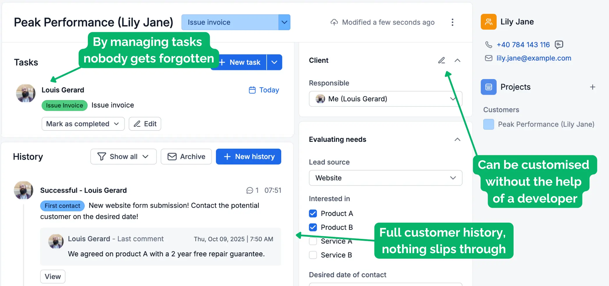 Kaikki asiakkaat yhdessä järjestelmässä – käytettävissä milloin ja missä tahansa. Aina ajantasainen järjestelmä täydellisellä asiakashistorialla.